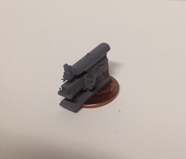 Primed only, Note that all three of the wheels, cranks and handles on the top were broke off, yet the ones one the side all survived and were formed perfectly. The two vertical bars on the very front did not form, or were broken at some point. There are all issues that I fixed in the newest upload to shapeways.